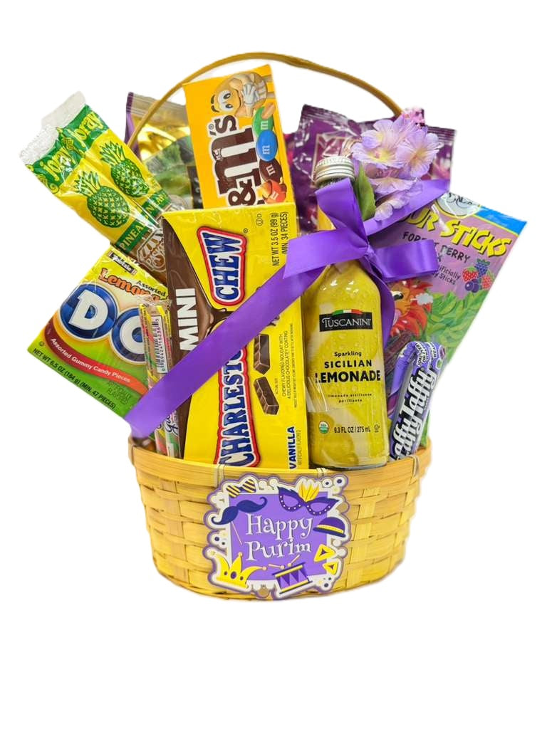 Celebrate Purim with this fun and bright gift basket. Our sunshine basket is filled with thoughtfully picked crowd favorites, in keeping with the meaning of Purim. This basket includes tasty sweets, yummy chocolates, wafers, a thirst quencher and salty goodness.